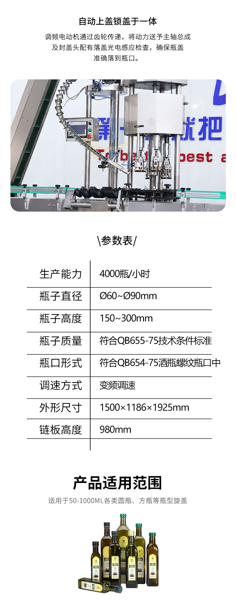 全自動四頭金屬鎖蓋機供鋁蓋酒瓶瓶封蓋用,整體采用304不銹鋼制作,運行穩定可靠。適用于50-100ml各類圓瓶、方瓶等瓶型旋蓋。