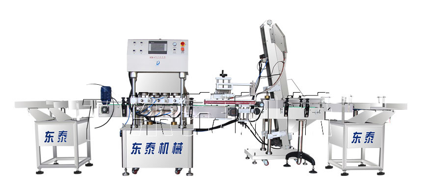 旋蓋部分:機(jī)器采用自動(dòng)下蓋方式,無(wú)需過多人工參與,自動(dòng)下蓋抽真空旋蓋,整機(jī)灌裝包裝流程一氣呵成。